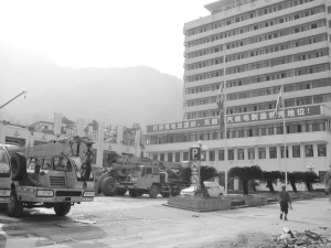 眼前的一切讓記者感到觸目驚心!廠門口的東汽廣場上,密密麻麻地布滿了救災帳篷,一直蔓延到廠區內。馬路邊停滿了綠色、白色和黃色的救災車。位于對面的綿竹市第三醫院已經基本上變成了一攤廢墟,一臺起重機和一群解放軍正在緊張地搜救被掩埋的人。救護車和警車不時發出凄厲的警報聲,劃破了這個曾經興旺的小鎮的寧靜。 進入建造在山腳下的東汽廠區,一幅幅場面更讓人揪心!大部分廠房都已遭受嚴重損毀,隨處可見倒塌的墻體和散落一地的玻璃碎片。損毀最嚴重的焊接和軸承車間,整個車間頂棚已經完全坍塌下來,只剩下一個岌岌可危的框架。停在車間門口的幾部小轎車被倒下的墻體砸成了柿子餅。 一位工人言語有些哽咽地對記者說,當時正在上班,很多工人在車間里,有些現在還埋在里面呢。由于車間目前有隨時倒塌的可能,這給搜救帶來了巨大的麻煩。 位于廠區辦公大樓前的圖書館,已經找不到樓頂,垮塌得只剩下兩層半。十幾層的辦公大樓雖在地震中幸免于難,但外墻上已可以看到明顯的裂痕。辦公大樓前旗桿上懸掛著的東汽廠旗,哀怨地掛在旗桿一半處。