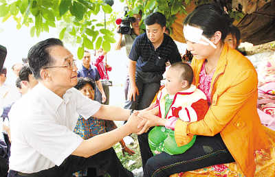 五月十五日,中共中央政治局常委、國務院總理溫家寶輾轉趕到位于四川北部的青川縣木魚鎮看望受災群眾。這是溫家寶在木魚鎮文武村安慰在地震中幸存的母子。