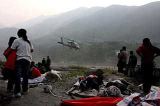 | 5月15日,映秀鎮的受傷群眾在等待著解放軍直升機的營救。 |