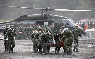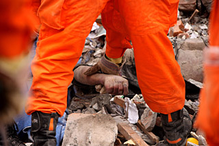 | 5月15日,解放軍救援部隊官兵在映秀鎮爭分奪秒搶救傷員。 | 5月12日,一個讓世界震驚的日子:中國四川省汶川縣發生8.0級特大地震。 災情就是命令,時間就是生命。 職業的敏感告訴我,這是當今中國最大的突發性災難事件,去抗災一線,刻不容緩。 5月14日13時30分,運輸機降落在成都雙流國際機場。我隨著海軍醫療隊的車隊,馬不停蹄,連夜向地震中心的汶川進發。
