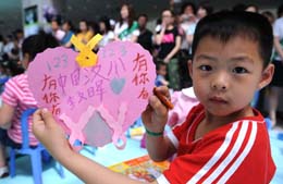 6月1日,參加活動的小朋友在展示自己繪制的祈?。當日,中國人壽天津市分公司與天津市青少年活動中心共同舉辦“真情六一、祈福災區”主題公益活動。來自天津各區縣的150多名少年兒童代表參加活動,表達對災區小伙伴的節日祝福。新華社記者:劉海峰 攝