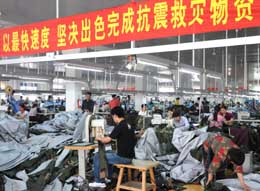 5月26日,揚州阿珂姆野營用品有限公司的職工在為災區趕制帳篷。目前,江蘇揚州阿珂姆野營用品有限公司和揚州金泉旅游用品有限公司員工加班加點,確保20萬頂帳篷在6月20日前全部運達災區。