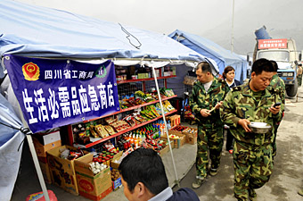 “三聯購物”超市負責人楊波對記者說,他們這里的商品價格與震前沒有變化,電腦在震后就沒調整過價格。絕大部分商品都是庫存貨,有一些商品,如火腿腸、紅燒肉罐頭等出現斷貨。當地一些提供商品的廠家在地震中毀損嚴重,要進貨就得從成都進,但是有一些貨進價漲了,如塑料制品,進價漲了10%左右?蓙淼念櫩投际钱數乩项櫩,或外地來的志愿者、援建者,所以不能漲價,不僅不能漲,還經常贈送一些東西給他們。 街頭一個經營小商品的婦女說:“我攤子的商品價格和地震前是一樣的,即使進貨價漲一點,我這里也不漲,大家都受災,將心比心! 翔鳳橋社區受災群眾安置點愛心超市工作人員介紹,這里的商品都是從成都市新都區桂湖摩爾超市配送過來的,所有商品都是特價,基本上是該超市價格的90%,沒有利潤,如果算上運輸費用,是賠錢的,目的就是保證安置點里的受災群眾能買得起。這里的生活日用品價格比外面都要便宜一些,如嬌子牌香煙一盒11.5元,外面要賣12元;可口可樂一聽1.7元,外面賣2元;娃哈哈牌礦泉水一瓶1元,外面賣1.5元等。 每天到這個愛心超市購物的受災群眾有千人次左右,3名工作人員從早6時起忙到晚23時,每天營業額約有4000元左右!敖裉焱k,電腦無法操作,如果是過去就停業了,但現在依然營業,記不住的商品價格,就跟大家商量著來,總之不能讓受災群眾感到不方便!币幻ぷ魅藛T說。
