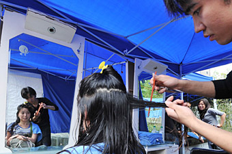 6月8日,一名理發師在為受災群眾修剪頭發。新華社記者 楊俊江