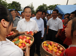6月20日至22日,中共中央政治局常委、國務院總理溫家寶到受汶川大地震波及的陜西、甘肅災區檢查指導抗震救災工作,看望干部群眾。這是6月21日,溫家寶在甘肅隴南市康縣平洛鎮貫溝村大莊社視察時,村民送來新摘的油桃。