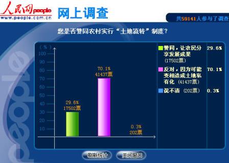 30年改革開放帶來農村巨變。十七屆三中全會召開,審議通過了《中共中央關于推進農村改革發展若干重大問題的決定》,標志著我國農村改革站在一個新的歷史起點上。其中“土地流轉”因為被廣泛關注和熱議,已經成為包括網絡在內的各種媒體的流行詞。中國共產黨新聞網針對“土地流轉”推出網上調查《您是否贊同在我國農村實行“土地流轉”制度?》,截止到10月20日9:00,共有59141人參與調查,網友留言278條。