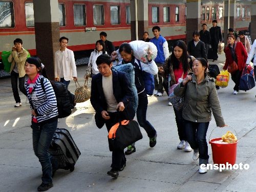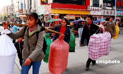 2008年11月20日,宜昌市火車站,從廣東等地提前返鄉的農民工絡繹不絕。近期,湖北宜昌市火車站里提前返鄉的農民工持續不斷,這些農民工主要返回鄂西、重慶、四川等地。