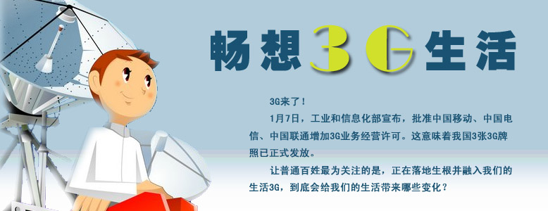 1月7日,工業和信息化部正式向中國移動、中國聯通、中國電信三大運營商發放了3G牌照。這標志著中國通信行業正式進入了3G時代。7日下午3點,記者撥打中國移動10086客服電話,發現自動語音接聽的第一句話已經改為“引領3G生活”。對于運營商來說,3G并不是專屬中高端人群,而是為所有手機用戶所準備的全新通訊和生活方式。